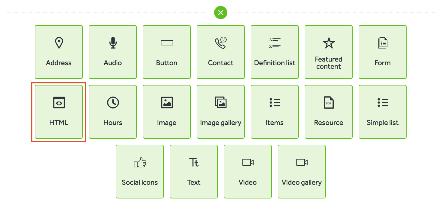 3. Select the green + button at the bottom of the page or in between the content blocks, where you'd like to add the HTML block.