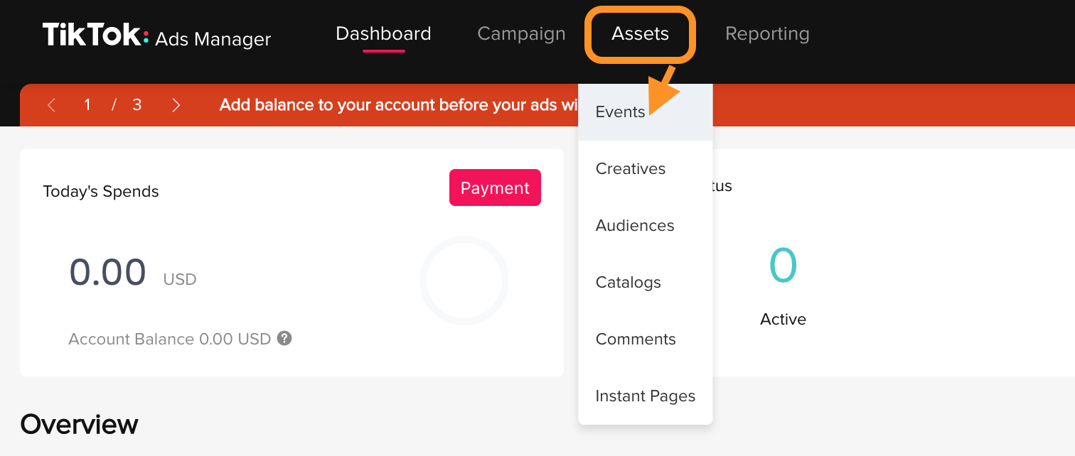 - Click Assets at the top of the dashboard and select Events from the dropdown menu.