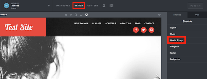 1. Select the Design tool from the gray navigation bar. Under the Sitewide section in the right-hand menu, click on Header & Logo.